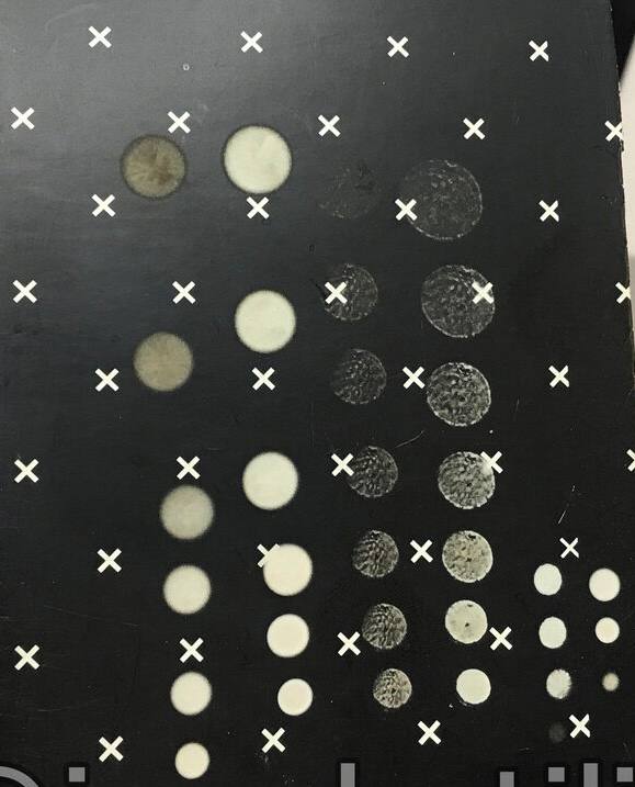 Нижний ряд - выстрелы на максимальной мощности стационарного лазера по тому же картону. Как можно видеть, по мере увеличения диаметра пятна, плотность пучка уменьшается. Однако происходит это равномерно, без перепадов и явных дефектов. Это значит, что даже при работе большим пучком сохраняется качество воздействия на каждый отдельный участок внутри этого пятна.