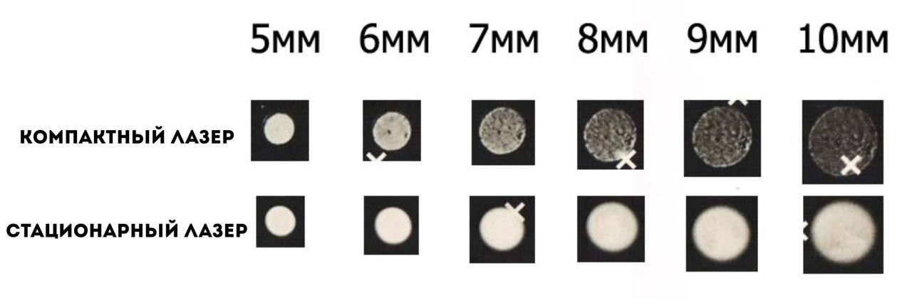 Верхний ряд - выстрелы на максимальной мощности компактного лазера по черному картону. При размере пучка 5мм мы видим плотное белое пятно, но уже начиная с 6мм проявляются дефекты. И чем больше становится пятно - тем виднее, что энергия распределяется в пучке неравномерно. При размере пятна в 4-5мм эти дефекты нивелируются общей плотностью пучка, но все равно оказывают влияние на результат процедуры.